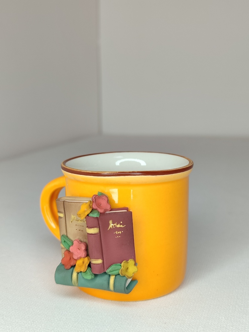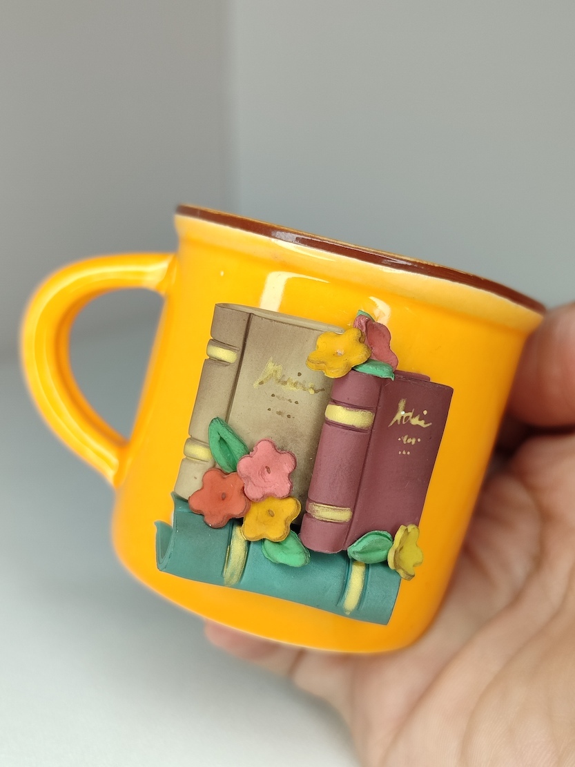این ماگ قشنگ با یه خمیر پلیمری مخصوص و دست ساز اینجا نشسته تا با یکی از شما کتاب دوست های عزیز بیاد و توی لحظه های کتاب خوندن یه شات قهوه شمارو مهمون کنه :)