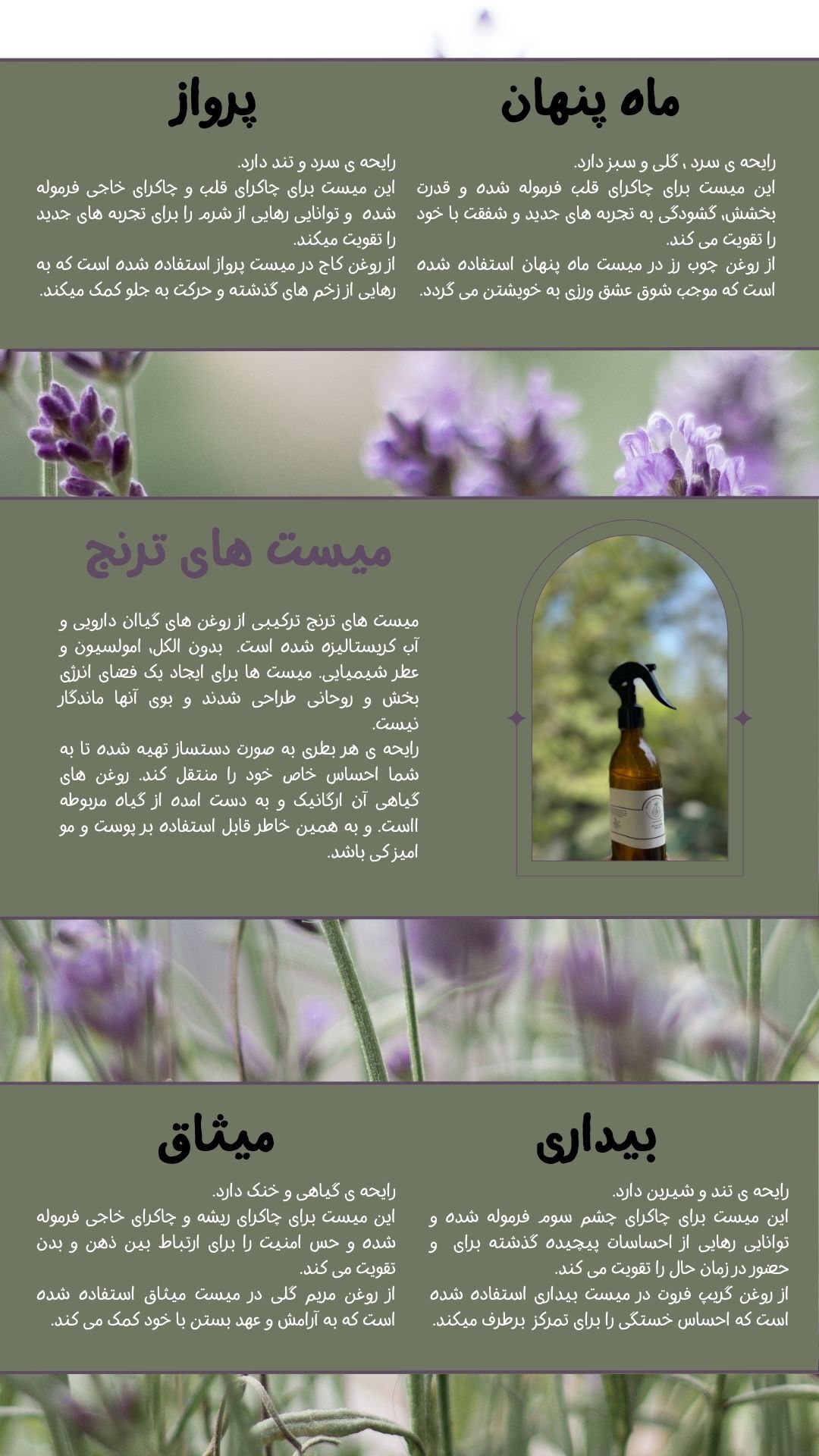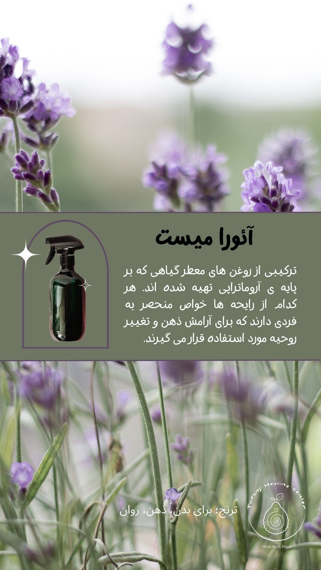 ترکیبی از روغن های معطر گیاهی که بر پایه ی آروماتراپی تهیه شده اند. هر کدام از رایحه ها خواص منحصر به فردی دارند که برای آرامش ذهن و تغییر روحیه مورد استفاده قرار می گیرند. میست های ترنج ترکیبی از روغن های گیاان دارویی و آب کریستالیزه شده است. بدون الکل، امولسیون و عطر شیمیایی. میست ها برای ایجاد یک فضای انرژی بخش و روحانی طراحی شدند و بوی آنها ماندگار نیست.