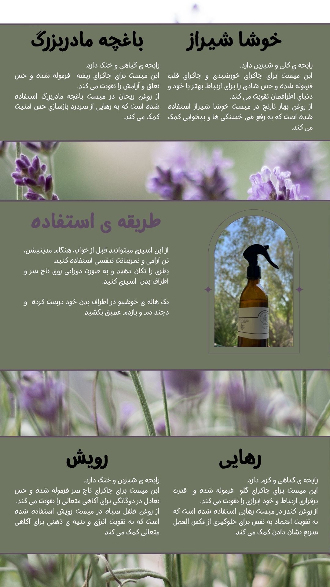 رایحه ی هر بطری به صورت دستساز تهیه شده تا به شما احساس خاص خود را منتقل کند. روغن های گیاهی آن ارگانیک و به دست امده از گیاه مربوطه ااست. و به همین خاطر قابل استفاده بر پوست و مو امیز کی باشد.